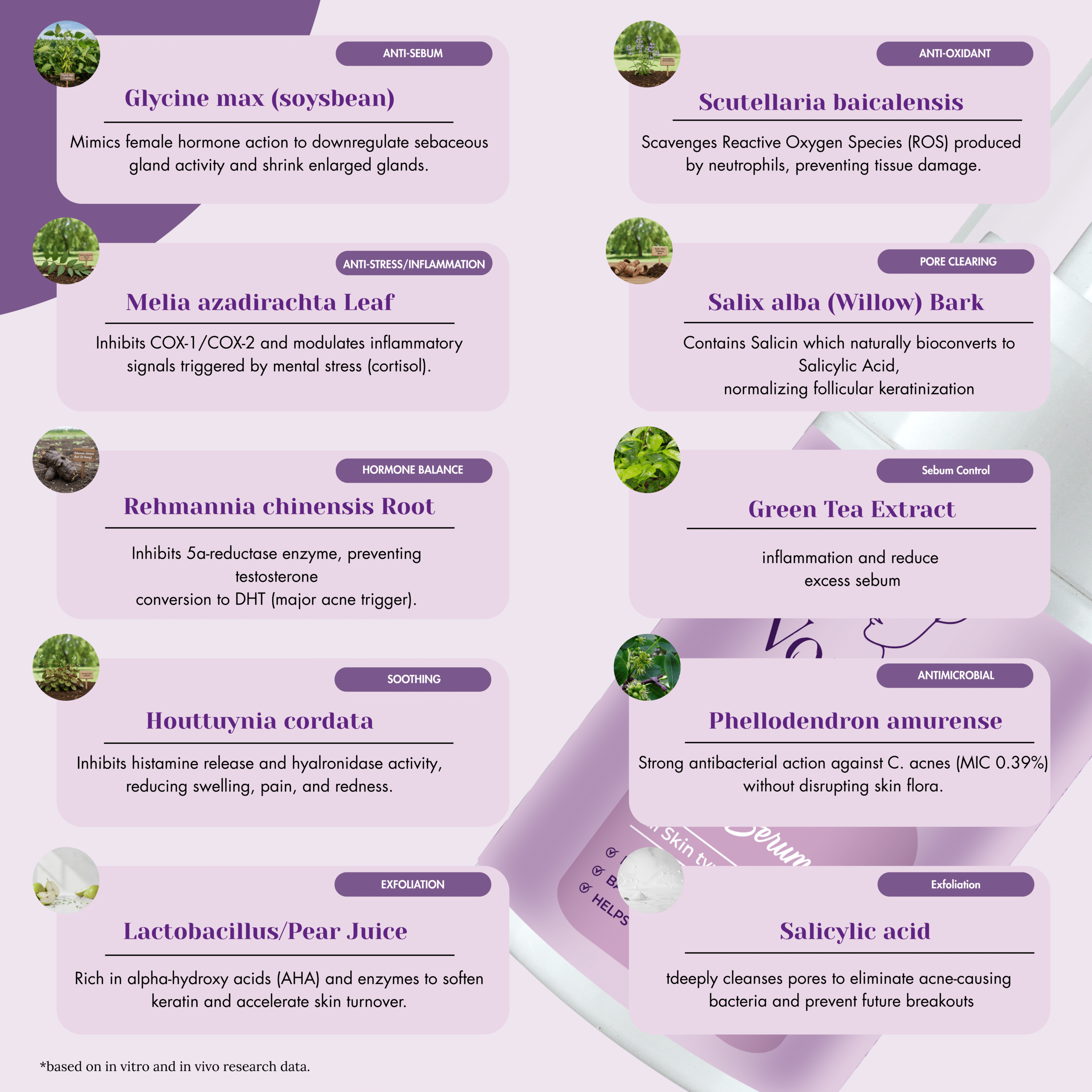 Inhibits 5α-reductase and shrinks sebaceous glands (Glycine Max, Rehmannia)