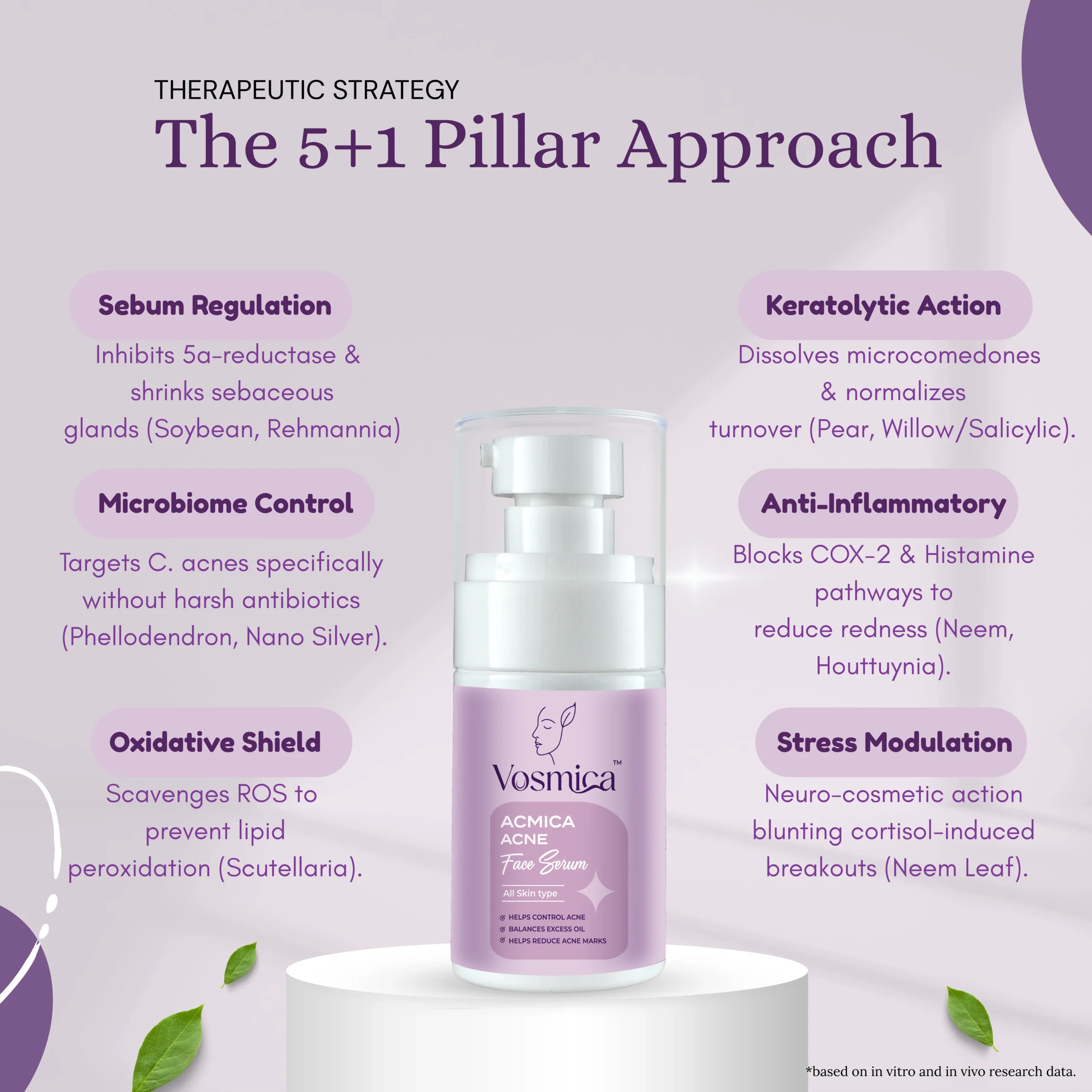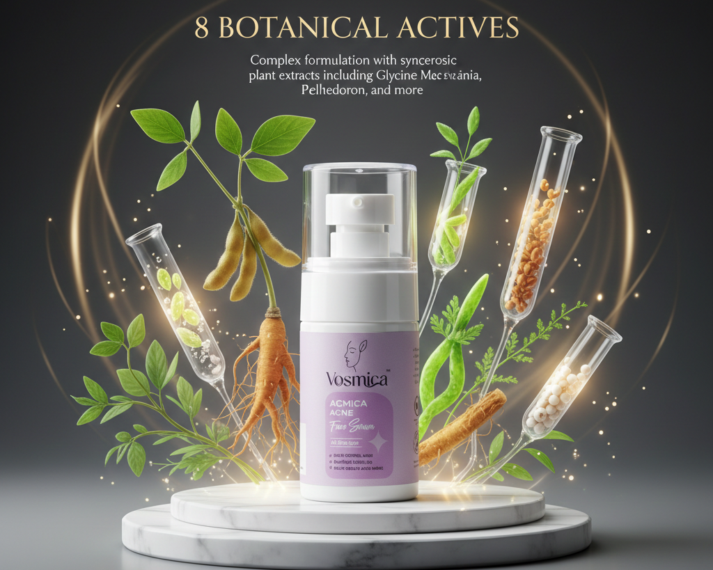 Acne is multi-causal. Single-molecule treatments often fail because they address only one phase. Acmica employs 8 botanical actives + advanced delivery systems to interrupt the acne cycle at every stage