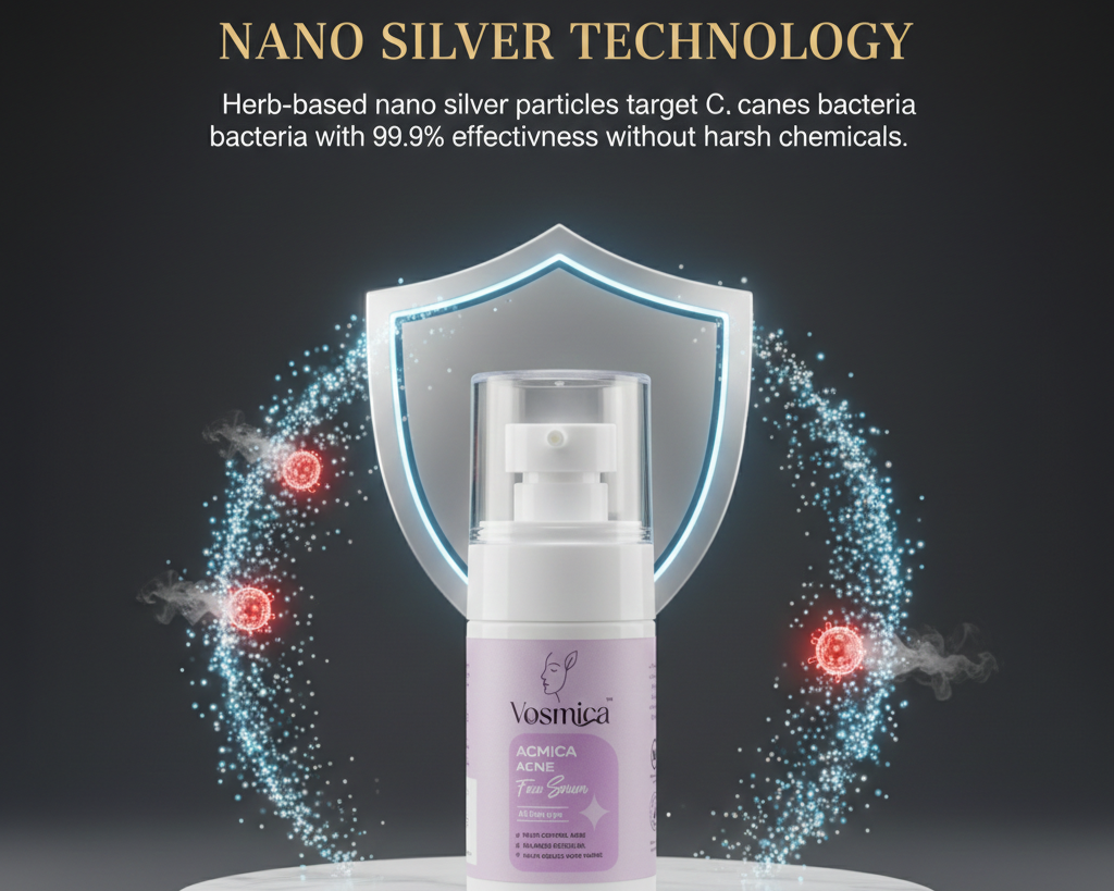 Herb-based nano silver particles target C. acnes bacteria with 99.9% effectiveness without harsh chemicals.